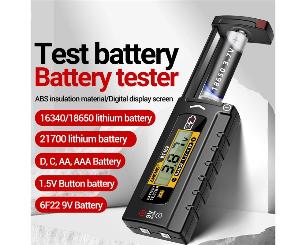BT169 може да измерва категория батерии: AAA, AA, 9V батерии, бутонни батерии, 21700 литиеви батерии, 18650 литиеви батерии, 16340 литиеви батерии