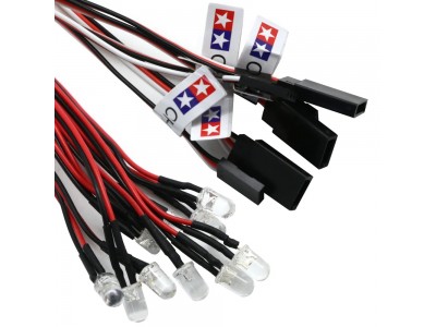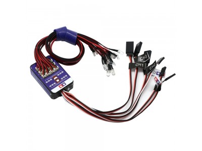 Този комплект от 12 LED осветителни системи е подходящ за 1/10 RC автомобили. Има четирицветни светлини, включително бели фарове, сини задни светлини, червени спирачни светлини и жълти мигачи. С подобрена платка може да поддържа високоволтов приемник и нормален приемник. И един комплект светлини може да се управлява от предавателя.